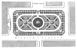 In 1826, Schinkel submitted his suggestion to move the position of the Leopold I Memorial as a part of the largest yet transfiguration of the square under his supervision. The other statues were also allocated new locations along the diagonals and lateral axes of the square. Besides these changes, he graced the surface of the square with greenery, a lawn dotted with lime trees and encircled by an oval walking path, which traced the borders of the square. Altogether, the new upgrades gave the space the appearance of a park.[19]
