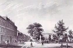 The newly featured area was dominated by Gerlach and Horst's (believed to be their work) Palais Marschall on the square's west side (No. 78), which also served as focal point of the old Mohrenstraße. The widening of the throughway to Wilhelmplatz – later Zietenplatz – was clearly intentionally conceived so as to allow a sweeping view of the grandiose structure as far as one ventured eastward.[7]