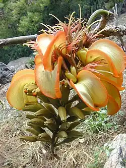 The wiliwili is summer (dry season) drought deciduous. The dry season usually begins in late April or in May, and trees in the wild typically lose all of their leaves before they bloom.[4] Trees in cultivation may retain much of their foliage through blooming time.[5] The flowers appear in the first half of the dry season, from April through July.[2] They form on horizontal or nearly horizontal racemes that are 7.5–15 cm (3.0–5.9 in) long. The flower color may be orange, yellow, salmon, greenish or whitish.[2] Sometimes all of these colors occur in a single population. The standard petal is erect, not enclosing the other petals. Like all of the erythrinas, the wiliwili is pollinated by birds.[6] The horizontal raceme and the erect standard are adaptations to pollination by passerine birds.[7] Many other erythrinas are pollinated by hummingbirds, which do not occur in Hawaii.