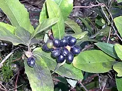 Plants in the genus Wilkeia are monoecious or dioecious trees or shrubs with sometimes toothed, papery to leathery leaves with many fine oil dots. The flowers are borne in leaf axils or on the ends of branchlets in cymes or panicles, usually with 3 to 9 flowers. Male flowers are more or less spherical, with 4 to 8 tepals usually with 4 to 8 stamens. Female flowers are flattened spherical, with minute tepals with many carpels with a short stigma. The fruit is an oval, black drupe about 15–20 mm (0.59–0.79 in) long.[2][3]