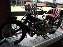 Wilkinson Sword produced some of the earliest motorcycles in 1903. These were two-cylinder machines with Belgian engines made by Antoine, which were marketed by a garage in Chelsea, London – one of the first motorcycle dealerships in the UK. The venture was not a success.[4] Wilkinson developed and manufactured the Wilkinson TMC, a luxury touring motorcycle between 1911 and 1916, when production was stopped by World War I.[5] The first 'Wilkinsons' were designed for military reconnaissance by P G Tacchi. Demonstrated to the British military in the summer of 1908, the Wilkinson motorcycle failed to impress the authorities, despite optional accessories including a sidecar complete with Maxim machine gun – and a steering wheel instead of handlebars.[6] The company continued development and exhibited a new version a year later at the Stanley Clyde Motorcycle Show at the Agricultural Hall, Islington, London in 1909.[7] Only about 250 Wilkinsons were produced before World War I. Restrictions brought the line to its end in spring 1916, and Wilkinson then produced thousands of bayonets for the war effort. After the war, they continued to develop the in-line four engine – but in a new car called the Deemster. They never resumed motorcycle production.[5]