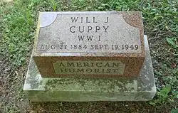 Cuppy's cremated remains were returned to his hometown and buried in a grave next to his mother's in Evergreen Cemetery. His grave was unmarked until 1985, when local donors purchased a granite headstone with the inscription, "American Humorist". In 2003, Cuppy received another memorial when a committee of the International Astronomical Union approved the name "15017 Cuppy" for an asteroid.[19] In 2019, the Indiana Historical Bureau approved placing a state historic marker at Cuppy's family home in Auburn.[20]