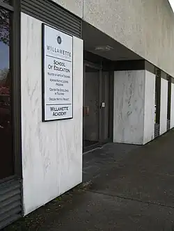 The university started the School of Education in 1988,[2] and added a Master of Arts in Teaching (MAT) program in 1992.[3] The Center for Excellence in Teaching (CET) program began in 1999 and offered graduate level courses for teaching professionals.[4] Willamette's Master of Arts in Teaching program had both a full-time and part-time option with four focuses in early childhood, elementary for grades 3 to 8, middle level for grades 5 to 9, and secondary for grades 7 to 12.[5] A part-time MAT option called Aspire was added in 2004.[6] The university closed the program because the university could not continue to offer a quality educational program due to financial issues and an uncertain market for teachers.[7]