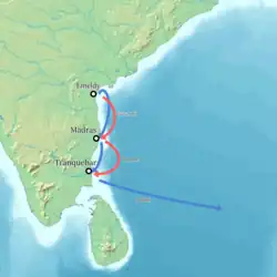 On 5 September 1643, Leyel arrived at Fort Dansborg and started investigating the conditions.[21][22] Leyel noticed heavy damage to the Dansborg fortress and found the warehouse completely empty.[23] Pessart explained this by claiming that Danborg was no longer of much use and that the warehouse was emptied to load two ships.[23] When the bad conditions became evident for Leyel, Pessart opted to leave Tranquebar for Madras; however, because of Leyel's distrust of Pessart, Leyel followed suit.[24] After reaching Madras, they sailed to Masulipatnam, and after that, Emeldy. At Emeldy, Leyel attempted to arrest Pessart and his men, yet when Leyel reached Pessart's tent, Pessart had already fled.[25] As a response, Leyel immediately sent out Jørgen Hansen with a longboat and a strongly armed crew to catch Pessart.[25] Hansen's pursuit proved unsuccessful, and Pessart could with ease reach Tranquebar in safety.[26]
