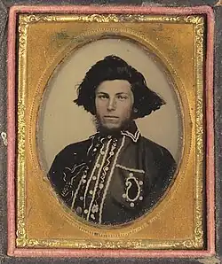 After the Civil War began in 1861, the demand for horses increased, and Anderson transitioned from trading horses to stealing them, reselling them as far away as New Mexico. He worked with his brother Jim, their friend Lee Griffith, and several accomplices strung along the Santa Fe Trail.[12] In late 1861, Anderson traveled south with Jim and Judge Baker in an apparent attempt to join the Confederate Army.[13] Anderson had told a neighbor that he sought to fight for financial reasons rather than out of loyalty to the Confederacy.[14] However, the group was attacked by the Union's 6th Regiment Kansas Volunteer Cavalry in Vernon County, Missouri;[e] the cavalry likely assumed they were Confederate guerrillas.[15] The Anderson brothers escaped, but Baker was captured and spent four months in prison before returning to Kansas, professing loyalty to the Union. One way he sought to prove that loyalty was by severing his ties with Anderson's sister Mary, his former lover.[13]