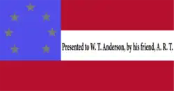 Union soldiers identified Anderson by a letter found in his pocket and paraded his body through the streets of Richmond, Missouri.[147] The corpse was photographed and displayed at a local courthouse for public viewing, along with Anderson's possessions.[148] Union soldiers claimed that Anderson was found with a string that had 53 knots, symbolizing each person he had killed.[149] They also found his flag, and one soldier described it as "... a small affair, made of fine silk, and the corner piece containing seven silver stars. On one side was -written in ink: " Presented to W. T. Anderson, by his friend, A. R. T.," and on the other side: "Do not let this be contaminated by Federal hands."[146] Union soldiers buried Anderson's body in a field near Richmond in a fairly well-built coffin.[150] Some of them cut off one of his fingers to steal a ring.[151][h] Flowers were placed at his grave, to the chagrin of Union soldiers.[152] In 1908, Cole Younger, a former guerrilla who served under Quantrill, reburied Anderson's body in the Old Pioneer Cemetery in Richmond, Missouri.[153] In 1967, a memorial stone was placed at the grave.[154]