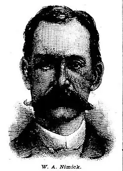 William Albert Nimick (September 2, 1848 – January 19, 1907) was a part owner of the Pittsburgh professional baseball team in Major League Baseball,[a] and was president of the team during the 1885–1890 seasons.[4][5] Initially nicknamed the Alleghenys, the franchise has been known as the Pittsburgh Pirates since 1891. The team competed in the American Association from 1882 through 1886, and has been a member of the National League since 1887. A native of Pittsburgh, Nimick died in Pasadena, California, in 1907.[6]