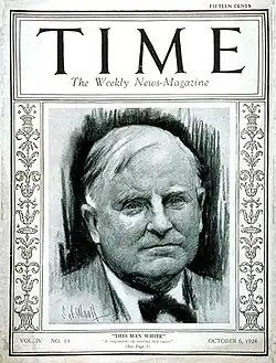In the 1928 presidential election, he condemned the Democratic nominee Al Smith as the candidate of "the saloon, prostitution, and gambling" for Smith's opposition to Prohibition.[13] He was an early supporter of Republican presidential nominees Alf Landon of Kansas in 1936 and Wendell Willkie in 1940. However, White was on the liberal wing of the Republican Party and wrote many editorials praising the New Deal of President Franklin D. Roosevelt.