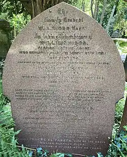 Higgs died of apoplexy at midnight on the 23 December 1889 at the Hotel Victoria in London where he was about to set off with his wife and sons for the Lady Mayoress's ball.[6] In 1907 his arms were carried by the Worshipful Company of Glovers in the procession of the Lord Mayor's Show.[9] He was buried on the western side of Highgate Cemetery.