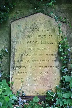 He is buried in Warriston Cemetery. The grave was re-exposed during works by the Friends of Warriston Cemetery in 2017 and lies against the southern wall of the main cemetery, backing onto the Water of Leith Walkway.