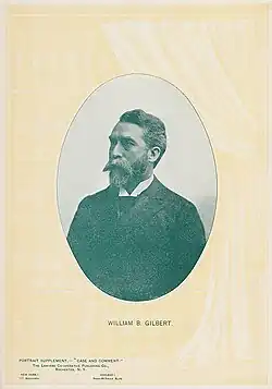 From 1893 to 1918, Gilbert lectured on constitutional law at the University of Oregon School of Law.[3] In 1898, he received an honorary doctorate of laws from his alma mater Williams College.[1] In Portland, Gilbert was a member of the Arlington Club, while in San Francisco, California (home of the Ninth Circuit Court) he was a member of the Southern Club.[1] Described as charming and industrious, he was a very private individual who also refused to ride in automobiles, which he disdained.[2]
