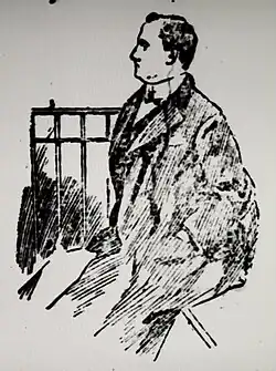 The defendant was brought up from below and advanced to the front of the dock, which he grasped tightly while standing upright and looking straight before him, throwing but one brief glance towards the ladies seated below the Bench ... The defendant, though outwardly calm, was labouring under suppressed excitement which he endeavoured to hide. He was dressed in a black morning coat and wore a high turned-down collar and black tie, and his general appearance was spruce. An attendant pushed forward a chair into which he readily subsided.[24]