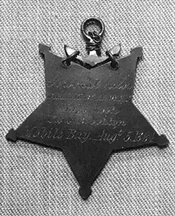 On board the U.S.S. Brooklyn during successful attacks against Fort Morgan, rebel gunboats and the ram Tennessee in Mobile Bay, on 5 August 1864. Stationed in the immediate vicinity of the shell whips which were twice cleared of men by bursting shells, Blagheen remained steadfast at his post and performed his duties in the powder division throughout the furious action which resulted in the surrender of the prize rebel ram Tennessee and in the damaging and destruction of batteries at Fort Morgan.[2]