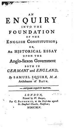 The title page of Samuel Squire's An Enquiry into the Foundation of the English Constitution (1745), which was printed by Bowyer