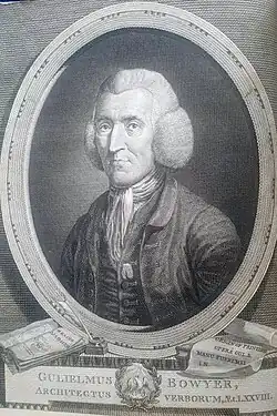 2. ^ a b c d e One or more of the preceding sentences incorporates text from a publication now in the public domainChisholm, Hugh, ed. (1911). "Bowyer, William s.v. William Bowyer (1699–1777)". Encyclopædia Britannica. Vol. 4 (11th ed.). Cambridge University Press. p. 349.