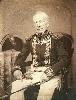 William Brown (also known in Spanish as Guillermo Brown or Almirante Brown) (22 June 1777 – 3 March 1857) was an Irish sailor, merchant, and naval commander who served in the Argentine Navy during the wars of the early 19th century.[2] Brown's successes in the Argentine War of Independence, the Cisplatine War, and the Anglo-French blockade of the Río de la Plata earned the respect and appreciation of the Argentine people, and he is regarded as one of Argentina's national heroes. The creator and first admiral of the country's maritime forces, he is commonly known as the "father of the Argentine Navy".[3][4][5][6]