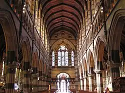 Butterfield's church of All Saints, Margaret Street, London, was, in the view of Henry-Russell Hitchcock, the building that initiated the High Victorian Gothic era. It was designed in 1850, completed externally by 1853 and consecrated in 1859.[1] Flanked by a clergy house and school, it was intended as a "model" church by its sponsors, the Ecclesiological Society. The church was built of red-brick, a material long out of use in London, patterned with bands of black brick, the first use of polychrome brick in the city, with bands of stone on the spire. The interior was even more richly decorated, with marble and tile marquetry.[1]