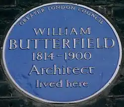 Butterfield received the RIBA Gold Medal in 1884. He died in London in 1900, and was buried in a simple Gothic tomb (designed by himself) in Tottenham Cemetery, Haringey, North London.[3] The grave can be easily seen from the public path through the cemetery, close to the gate from Tottenham Churchyard. There is a blue plaque on his house in Bedford Square, London.