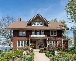Three years later, brother William and his wife Dora had the same firm design for them the large home pictured. Where Cornelius's house had been more vertical and British, mixing some Prairie Style elements with Tudor Revival forms, William's house was more relaxed, pushing Prairie style in the direction of a bungalow and a Swiss chalet. Elements of Prairie style are the broad eaves, the horizontal emphasis in the front, and the small bands of windows. The false half-timbering in the dormer end is a Tudor element. The gable-roofed dormer and the balconies recall a chalet. Walls are dark brick. The roof was probably first covered with wood shingles or tile. A balcony hangs on each end of the house, with the one to the southwest supported by decorative brackets along the lines of those Louis Sullivan designed for the Harold Bradley house a few years before. Inside is oak woodwork and windows with leaded glass borders, typical of Prairie Style.[1]
