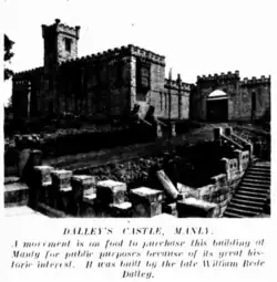 The homes he owned on the northern beaches were Marinella, commonly called Dalley's Castle, at Manly and a house called variously Yellamb i, Tallamalla, Bilgola House and Bilgola Cottage, immediately behind Bilgola Beach. While the house at Bilgola was built as a weekender, Marinella was built as a home, although Dalley's use of both was brief. Dalley bought 0.4ha on a knoll overlooking Manly in late 1882 and had a large home, called Marinella, erected upon it, although it was invariably known as Dalley's Castle because of its size and dominant position overlooking the village. The property Dalley bought also included an existing cottage and a stone tower that had previously housed a camera obscura. The Gothic Roman castle was built in 1882–1883 and by 1884 Dalley is listed as living there, although the following years were among his busiest and he had other properties closer to the city, so the amount of time he spent at Marinella is uncertain. Dalley's Castle was demolished in 1939, despite strong local opposition, and Housing Commission flats, ironically called Marinella, were built on the site.[8]