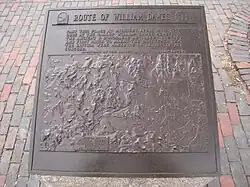 Dawes's ride is commemorated on a traffic island in Cambridge, Massachusetts, heavily travelled by pedestrians, at the intersection of Garden Street and Massachusetts Avenue in Harvard Square, and known as Dawes Island. Dawes's passage through the area is represented by bronze horseshoes embedded in the sidewalk, as hoofprints, accompanied by an inscription giving his name and the date (inaccurately stated as April 19, 1775), and by historical displays.[12][13]