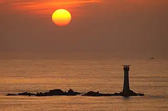 James Douglass, the brother of William, was at that time engaged in building the 135-foot-tall (41 m) Wolf Rock Lighthouse off Land's End when James Walker died, and James was appointed as the new engineer-in-chief to Trinity House. William was called in to continue the work near the Isles of Scilly.[1]: ch4 Continuing his system of being the first to land, the last to leave and ensuring safety lines were fastened to each man William, who was a strong swimmer, worked on the lighthouse, on one occasion risking his life to steer a boat in storm seas close to the partly-built lighthouse so that supplies could be delivered to the men stranded on the rock.[1]: ch5 Completed on 19 July 1869,[3] the light was first lit in January 1870.