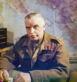 In February 1944, Morgan was made General Officer Commanding-in-Chief for Southern Command.[7] While still appointed a temporary lieutenant general, Morgan's permanent rank was advanced to major general in May 1944.[17] In March 1945,[18] he became Chief of Staff to the Supreme Allied Commander in the Mediterranean Theatre, Field Marshal Sir Harold Alexander. On 29 April 1945, he accepted the surrender of all Axis forces on the Italian Front with the surrender signed at Caserta.[7][6] In September he was appointed Deputy Supreme Allied Commander for the Mediterranean Theatre and then in October succeeded Alexander as the Supreme Allied Commander.[7][6] Also in October he was made a Knight Commander of the Order of the Bath.[19] The Morgan Line, which at one time demarcated the boundary between Italy and Yugoslavia, was named after him.[20]