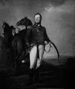 Dyott's next employment came in May 1810 when he was appointed Inspecting Officer of Militia for the Severn District, encompassing much of South Wales. Then in August he was moved to command the Inland District, with his headquarters at Lichfield.[1][46] In 1811 he took command of a force consisting of the 15th Dragoons and Berkshire Militia with which he suppressed Luddism in Nottingham. He continued in command at Lichfield until 4 June 1813 when he was promoted to lieutenant-general. Dyott was not appointed to a new command after this, but on 7 April 1825 was given the colonelcy of the 63rd Regiment of Foot.[1][63] Prince William Henry succeeded George IV, becoming William IV, in 1830, and Dyott was disappointed not to be remembered by his old friend, saying "Prince's promises are not permanent proofs".[64] He was however promoted to general on 22 July the same year.[1][63]