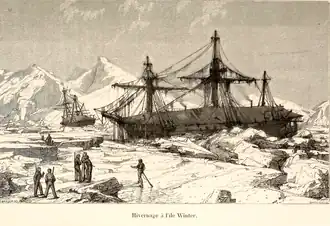 Continuing west they passed 110° W (about 600 miles (970 km) west of Lancaster Strait) which entitled them to a £5,000 award offered by Parliament. Finally blocked by ice they turned back to a place Parry called Winter Harbour on the south shore of Melville Island, somewhere near 107- or 108° W. Cutting their way through new ice the ships reached anchorage on 26 September.