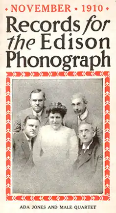 ![]() Photoportrait of singers Ada Jones (seated center) and "Male Quartet" on Edison Records catalog supplement for November 1910. Quartet of singers surrounding Jones are identified as "clockwise from bottom left: Billy Murray, John Bieling, Steve Porter, and William F. Hooley".[1] | |