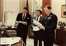 Martin served as the Executive Secretary of the National Security Council in the Reagan White House.[15] The Executive Secretary is the head of the NSC as defined by the National Security Act of 1947. In practice, it serves as the NSC's chief of staff responsible for coordination, budget and management of the National Security Council. The Executive Secretary coordinates the National Security Council meetings and manages vital policy and information communication from the Cabinet and the NSC staff to the President. One of the duties of Mr. Martin as Executive Secretary was to oversee the White House Situation Room located in the basement of the West Wing of the White House which is in 24/7 communication with the Department of Defense, State Department, Intelligence Community and US embassies abroad.