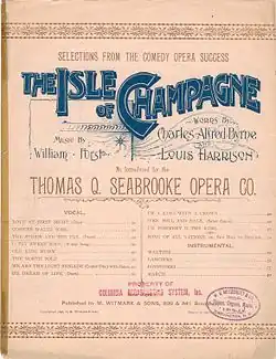 In the late 1880s and early 1890s, Furst was the orchestra director at the Tivoli Theatre in San Francisco, California. He composed his only opera, Theodora, for the Tivoli. In 1892, he composed the successful operetta The Isle of Champagne. In 1893, he published "The Girl I Left Behind Me" and moved to New York City, becoming the music director at the now-demolished Empire Theater.[3] The same year, he composed the music (along with Charles Alfred Byrne and Louis Harrison) for the musical Miss Nicotine with Lillian Russell[5] and Marie Dressler[6] Another such Empire piece was The Little Trooper, starring Della Fox (1894) followed by The Little Minister (1897).[4] In 1898, he composed another such piece for the Empire, A Normandy Wedding (an adaptation of the French Papa Gougon), which received an enthusiastic reception in New York at the Herald Square Theatre.[7]