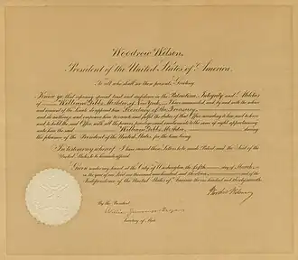After taking office as president, Wilson appointed McAdoo secretary of the Treasury, a post McAdoo held from 1913 to 1918.[9][10][11][12]