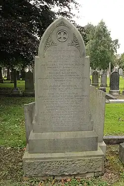 William died in Whithorn on 11 September 1897 [7] at 87 George Street of diabetes. He was presumably being cared for by the proprietor, Agnes Anderson widow of Thomas Anderson marine engineer. His body was taken to Edinburgh for burial and he lies in Grange Cemetery with his parents. The stone lies near the centre of the north-east section. Although some records state that he is interred at Whithorn the gravestone in the Grange specifically states "interred here".[8]