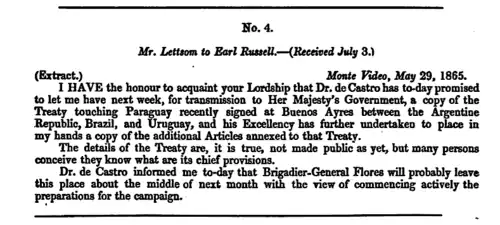 One of its provisions concerned the acquisition by Argentina of large tracts of territory then in dispute between it and Paraguay. Lettsom was not satisfied about this and surreptitiously obtained a copy of the Treaty from the Uruguayan diplomat Dr Carlos de Castro. He forwarded it to London and the British government ordered it to be translated into English and published to Parliament. When the text became available in South America there was outrage in several quarters, some because of the Treaty's content,[17] others because it had been published at all.[18]