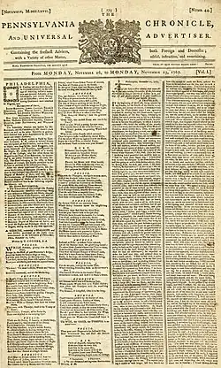Goddard established as the mouthpiece of the Anti-Proprietary party the Pennsylvania Chronicle and Universal Advertiser on January 26, 1767.[1] He founded the Pennsylvania Chronicle to rival David Hall's Pennsylvania Gazette[b] and William Bradford's Pennsylvania Journal, who became silent partners with Goddard. During this time Goddard had employed Isaac Collins in his print shop.[32][33][c] The Galloway and Wharton partnership soon dissolved over disagreements about debts, and Goddard continued the newspaper alone until the last issue, number 368 on February 8, 1774.[1] Goddard published a seventy-two-page pamphlet The Partnership in 1770, accusing his partners Galloway and Wharton, two of the city's most creditable citizens, of attempting to destroy his business.[35] In retaliation, Galloway and Wharton had Goddard imprisoned for debt in September 1771, having to serve three weeks.[20][27][36]