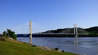 The William H. Harsha Bridge is a cable-stayed bridge carrying U.S. Route 68 that connects Maysville, Kentucky, and Aberdeen, Ohio, over the Ohio River. It is named for William Harsha, who represented the Ohio portion of the area in the United States House of Representatives. Construction on the bridge started in 1997 and it opened in 2000. The bridge has a main span of 1,050 feet (320 meters) and a total span of 2,100 feet (640 m).[2] The Simon Kenton Bridge, a suspension bridge built in 1932, is located nearby.