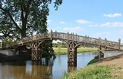 Only one other work which can be positively identified as Halfpenny's and of which traces survive is a "Chinese" bridge built for Lord Deerhurst (later the sixth Earl of Coventry) at Croome Park, Worcestershire in 1747–48.[6] Archaeology students at the University of Worcester uncovered the substantial stone foundations of the bridge in summer 2009, and the National Trust built a replica of the bridge, using Halfpenny's drawing, as part of a plan to recreate Capability Brown's original landscape.[7][8]