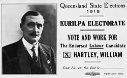 William Hartley (1868 – 15 March 1950) was an Australian politician. He was the Labor member for Kurilpa in the Legislative Assembly of Queensland from 1915 to 1918.[1]