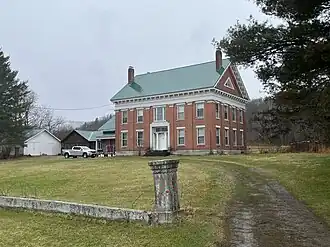 The William Hayden House stands on the west side of Vermont Route 14, between Wylie Hill Road and Route 14's crossing of the Rogers Branch of the Black River. It is a 2+1⁄2-story brick building, with a side gable roof, end chimneys, and granite foundation. It is set back from the road, accessed by a semicircular drive, with a low granite wall paralleling the road. The driveway entrances are marked by carved stone posts, as is a pedestrian entrance at the center of the semicircle. The house's main block has a five-bay front facade, articulated by brick pilasters with granite capitals. Windows are rectangular sash, set in openings with granite sills and lintels. The window above the entrance is a three-section window, with narrow side windows in the Palladian style. The entrance is recessed in a rectangular granite-lined openings, with flanking sidelight windows and round columns, and a large transom window above. Below the roofline is a tall entablature, and an eave decorated with drop pendants. A single-story brick ell, reproducing one destroyed by fire, extends to the south, joining the house to a 20th-century garage.[2]