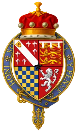 On 2 January 1554, he was appointed to meet the Spanish ambassadors who had come to London to negotiate a marriage between Queen Mary I and King Philip II of Spain.[15] Wyatt's rebellion broke out on 25 January, and Howard was among those who raised the militia to defend London. On 7 February 1554, he held Ludgate, preventing the rebels from entering the city and leading to their surrender a few hours later.[16] He was appointed to Queen Mary's Privy Council on 3 January 1554, and on 11 March, was created Baron Howard of Effingham. On 20 March 1554, he was granted a patent as Lord Admiral, replacing Lord Clinton. On 9 October of that year, he was made a Knight of the Garter.[17] Around this date, there was a masque at court, featuring mariners' costumes made of gold and silver cloth, which Francis Yaxley thought was Howard's production.[18]