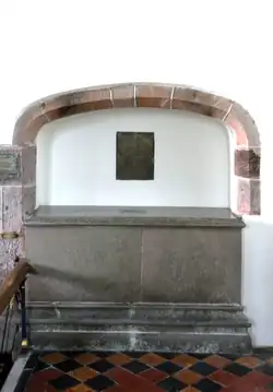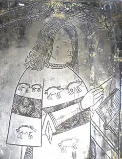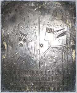 A monumental brass of Huddesfield and his second wife Katherine Courtenay survives in Shillingford St George Church,[28] and the arms of Bosome (Azure, three bird bolts in pale points downward or) survive in a stained glass window in the same church.[29] The brass is affixed to the wall on the north side of the chancel, above a chest tomb, with grey marble slab on top, set into an Easter Sepulchre style alcove remade in the 19th century.[30] Around the edge of the slab is an ident for an inscription in brass, now lost, but transcribed in 1630 by the Devon historian Thomas Westcote (c. 1567 – c. 1637) as follows:[31]