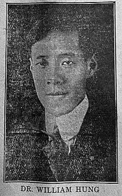William Hung (Chinese: 洪業; October 27, 1893 – December 22, 1980), was a Chinese historian and sinologist who taught for many years at Yenching University, Peking, which was China's leading Christian university, and at Harvard University. He is known for bringing modern standards of scholarship to the study of Chinese classical writings, for editing the Harvard-Yenching Index Series, and for his biography of Du Fu, Tu Fu: China's Greatest Poet, which is considered a classic in the English world on the studies of Du Fu.[1] He became a Christian while a student at the Anglo-Chinese College in Fuzhou, then went to Ohio Wesleyan University, Delaware, Ohio, Columbia University, and Union Theological Seminary. On his return to China, he became Professor and Dean of Yenching University, where he was instrumental in establishing the Harvard-Yenching Institute.[2] He came to Harvard in 1946 and spent the rest of his life in Cambridge, Massachusetts, teaching and mentoring students.