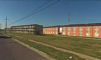 The William J. Fischer Housing Development, better known as the Fischer Projects, was a housing project in Algiers, New Orleans, Louisiana, United States. It was known notoriously for a series of high-profile murders in the 1970s and 1980s.[1] It was the last conventional public housing development constructed in New Orleans, and one of the first to begin demolition. It originally consisted of a 13-floor high-rise and fourteen 3-floor units.[2] The area has been undergoing redevelopment since about 2004 and currently none of the original low-rise buildings remain.[3] The development is located along Whitney Avenue in the Algiers area of the city's west bank, which is part of the 15th Ward and is named for William J. Fischer who served as chairman of HANO in the 1950s. The property is now converted to a small low-income housing development.