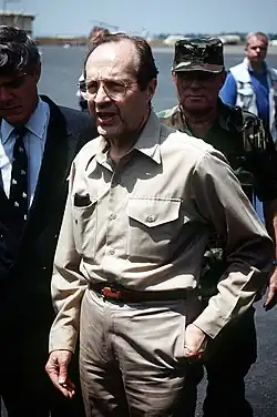 In February 1995, Perry asked for $246 billion for the Department of Defense for FY 1996.[35] This proposal became entangled in the controversy during 1995 over the House Republicans' Contract with America, their efforts to spend more on defense than the administration wanted, and the continuing need for deficit reduction.[36][37]