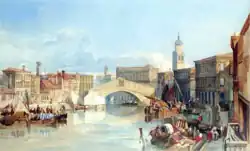 Müller was born at Bristol, the son of J. S. Müller, a Prussian from Danzig, curator of a museum in Bristol.[1] He first studied painting under James Baker Pyne.[2] His early pictures were mostly of the scenery of Gloucestershire and Wales, and he learned much from his study of Claude, Ruysdael, and earlier landscape-painters.[3] He witnessed the 1831 Bristol riots and recorded some of the scenes in a series of "raw and brilliant oil and watercolour sketches".[4] In 1833, he exhibited at the Royal Academy for the first time, showing Destruction of Old London Bridge-Morning. The next year he made a tour through France, Switzerland, and Italy.[3]