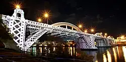 The style of the bridge's design is Art Deco, which was popular at the time. MR Hornibrook company built the bridge that consists of two piers that were built in the river and two pylons on the river banks, which support three graceful arches.[2] The rainbow arch type, as it was described, was claimed to be the first of its type in Australia.[3] It is a steel frame arch bridge with an unusual concrete veneer, treated to make it appear like "light-coloured porphyry".[3]