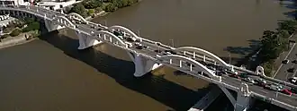 The bridge spans between ground level on the higher northern bank, ramping down to Grey Street inland from the southern bank. To achieve this, the bridge was constructed with three major spans of arched ribs across the river, with two smaller arches at the northern embankment and a single arch at the southern embankment, and a viaduct consisting of 16 spans ramping down to Grey Street to the south. The southern ramping section curves towards the southeast in plan, crossing Montague Road to align with Grey Street. The two smaller arches at the northern embankment are no longer extant, and have been replaced by precast, prestressed concrete deck units above Coronation Drive, which links onto the riverside expressway.[1]