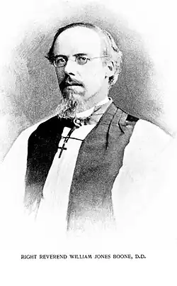 William Jones Boone Jr. (17 May 1846 – 5 October 1891) was the fourth Anglican missionary bishop of Shanghai.[1] Boone was born in Shanghai, son of and namesake of William Jones Boone and his wife Sarah Amelia De Saussure Boone.[2] After his mother’s death, he and his brother were taken to the US for their education.[3]
