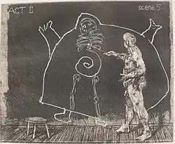 In 1996–1997, he produced a portfolio of eight prints titled Ubu Tells the Truth, based on Alfred Jarry's 1896 play Ubu Roi. These prints also relate to the Truth and Reconciliation Commission conducted in South Africa after the end of apartheid.[9] One of the stark and somber prints from this portfolio, in the collection of the Honolulu Museum of Art, is illustrated.